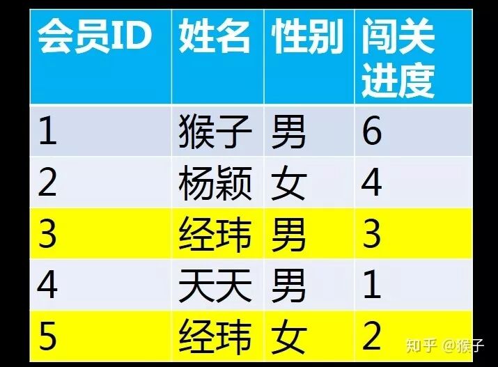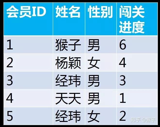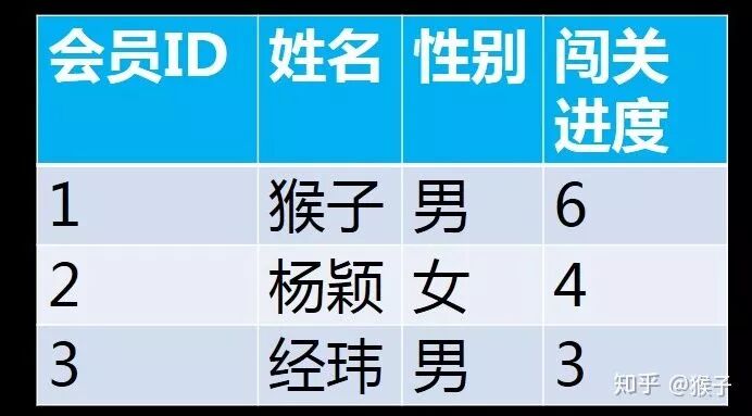 上面的表中每一列都有一个名字来标识出该列,行里记录着数据。其中,用 “会员 ID” 用来唯一标识用户,'闯关进度' 用来记录每个会员学习到哪一关了。