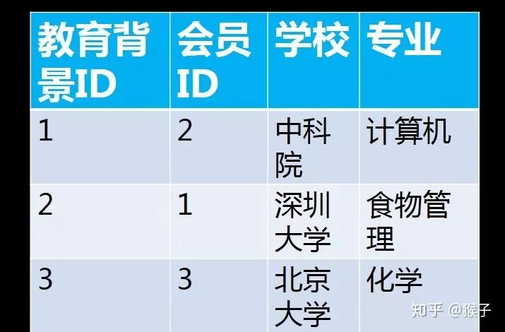这两张表通过会员 ID 关联起来,为了更清楚的看到这两个表的关系,下面的图中我用相同颜色代表同一个会员的信息。例如在会员表里姓名是猴子的会员 ID 是 1,那么我想知道该会员的教育背景,我就可以在教育背景这个表里去查找 “ 会员 ID” 值是 1 的行,最后发现这行数据的教育背景 ID 是 2,对应的就找到该会员的教育背景信息了。